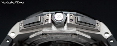 Angesichts der großen Kronenschutz- und Drücker ist das Titangehäuse tatsächlich 44 mm. Die Lünette, Drücker und Krone in schwarzer Keramik. Wie es bei der Royal Oak im Allgemeinen der Fall ist, hat AP ein präzises und feines Finish mit den matten und polierten Abschnitten des Gehäuses erreicht.